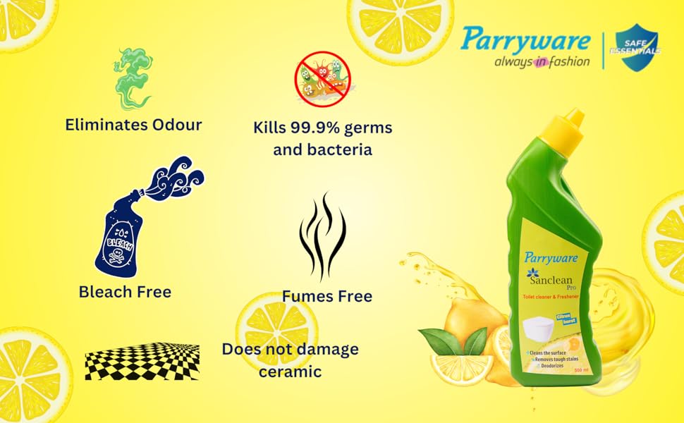 1. Safe on skin 2. Does not damage the ceramic 3. Cleans, removes stains, provides shine 4. Bleach and fumes free 5. Deodorizes 6. Gives complete disinfection