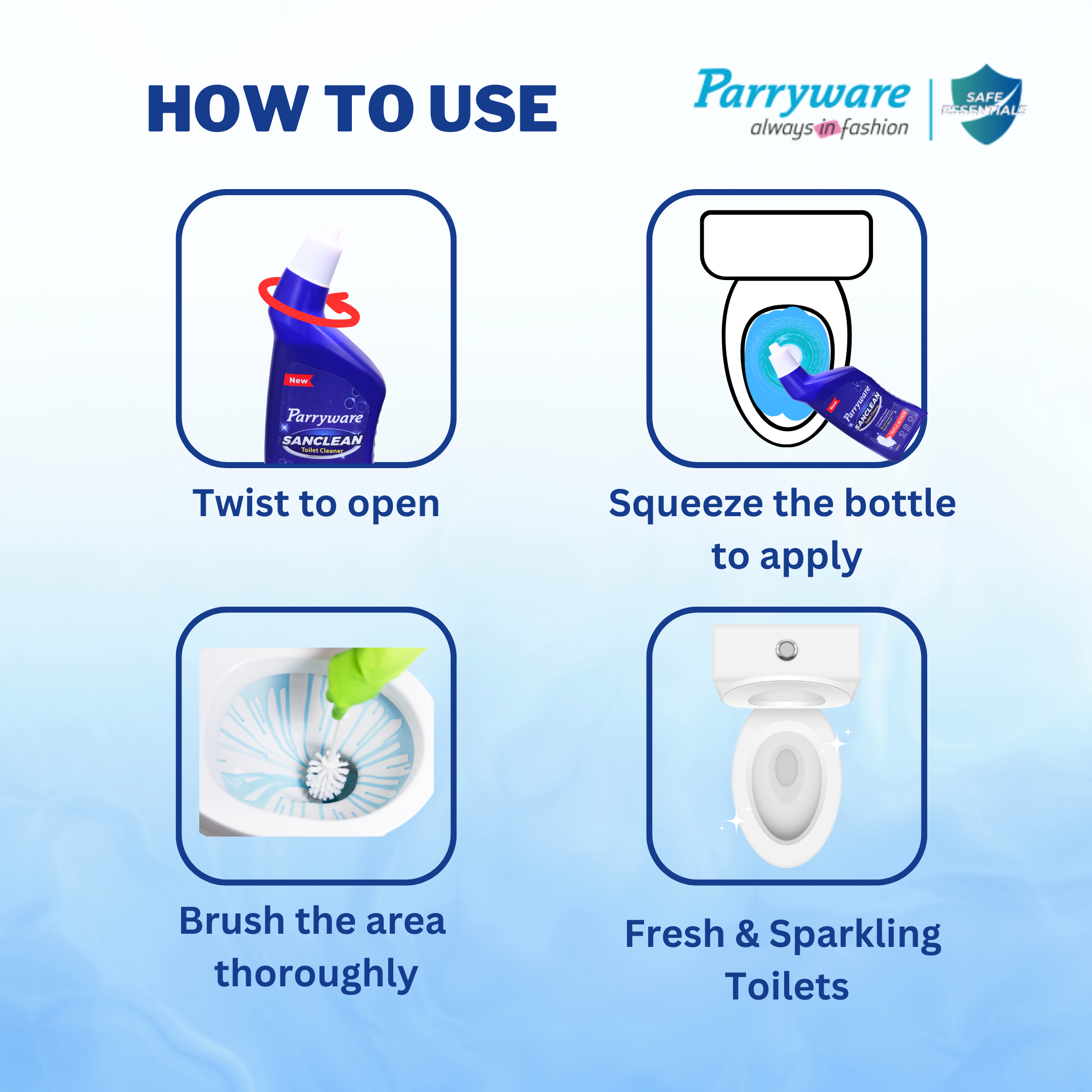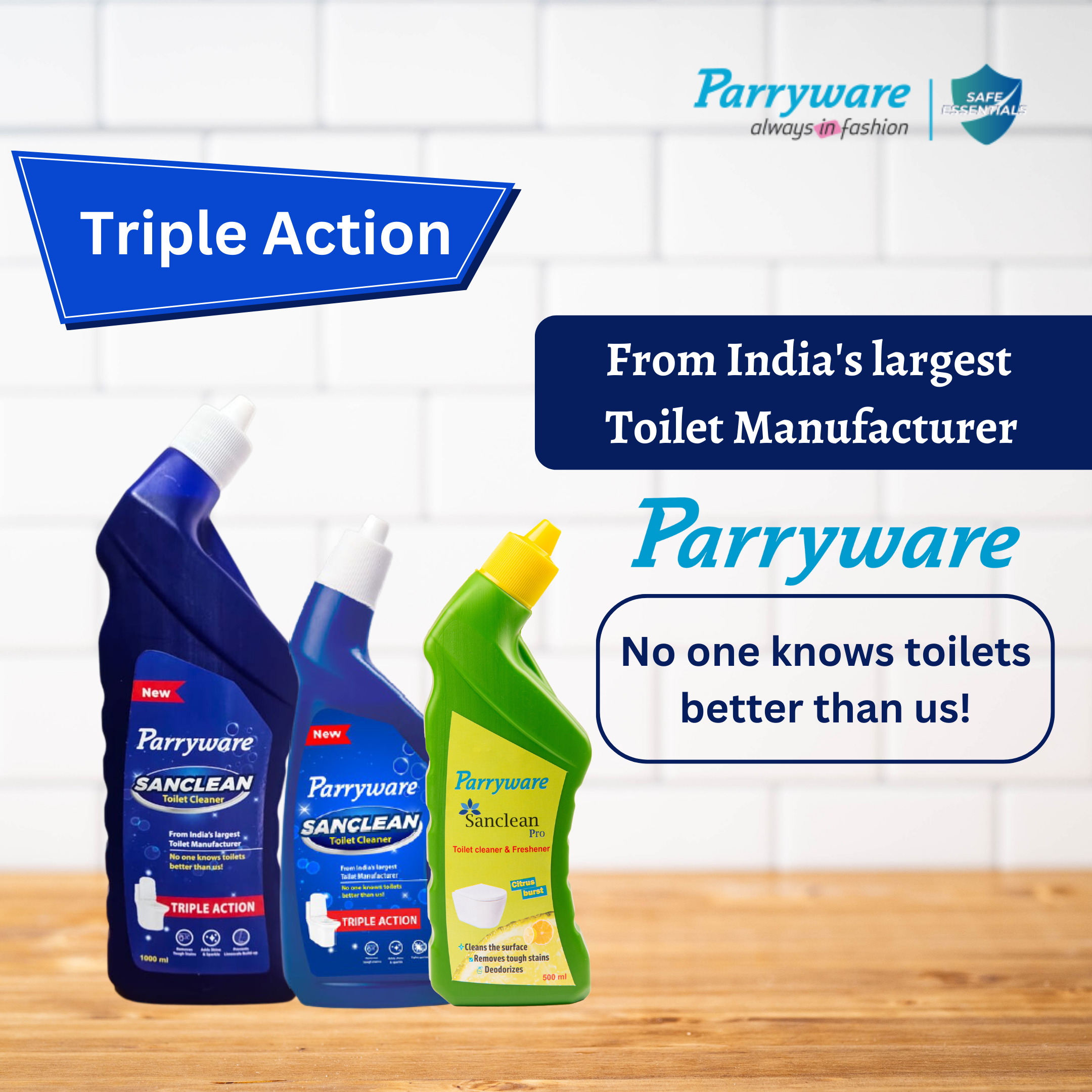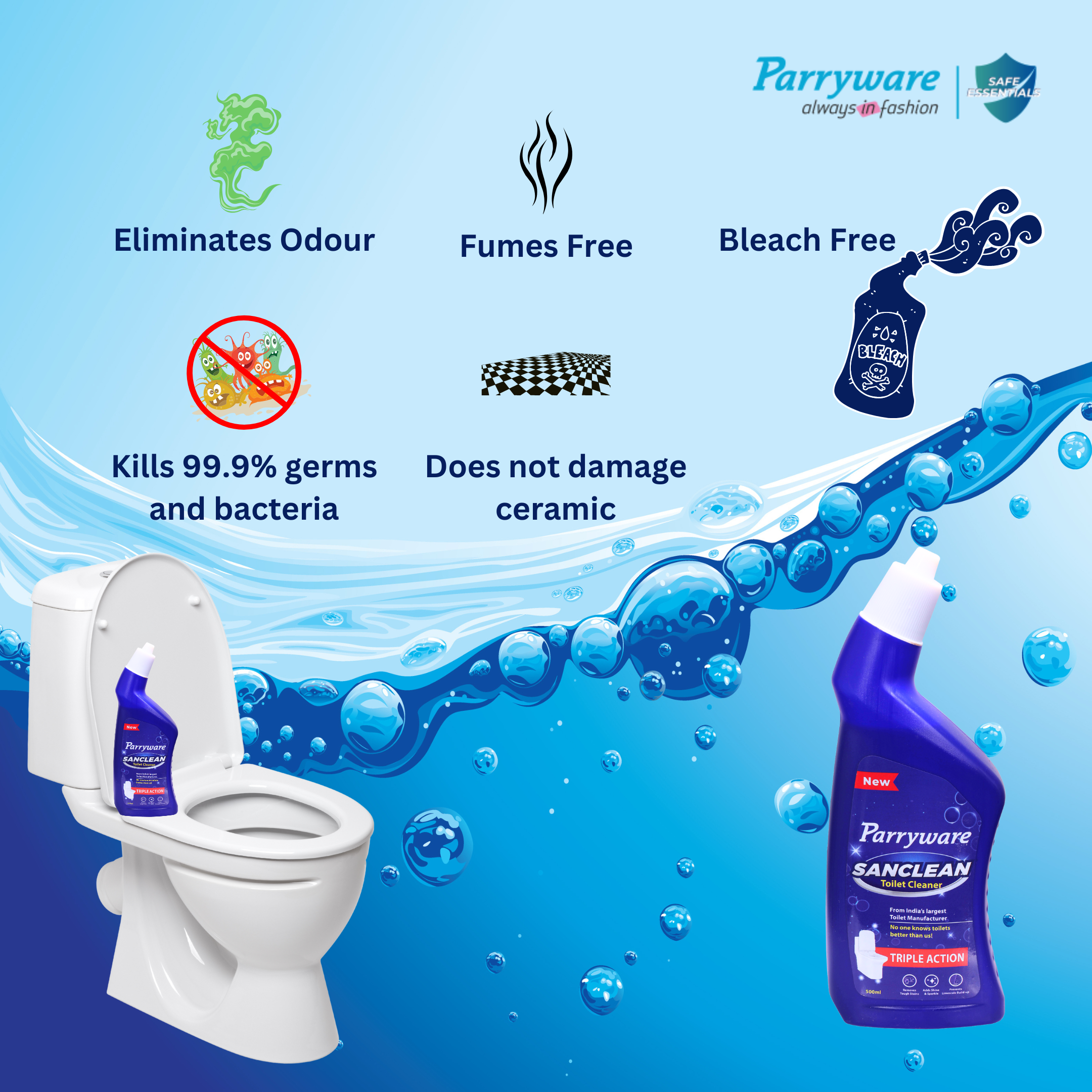 1. Safe on skin 2. Does not damage the ceramic 3. Cleans, removes stains, provides shine 4. Bleach and fumes free 5. Deodorizes 6. Gives complete disinfection